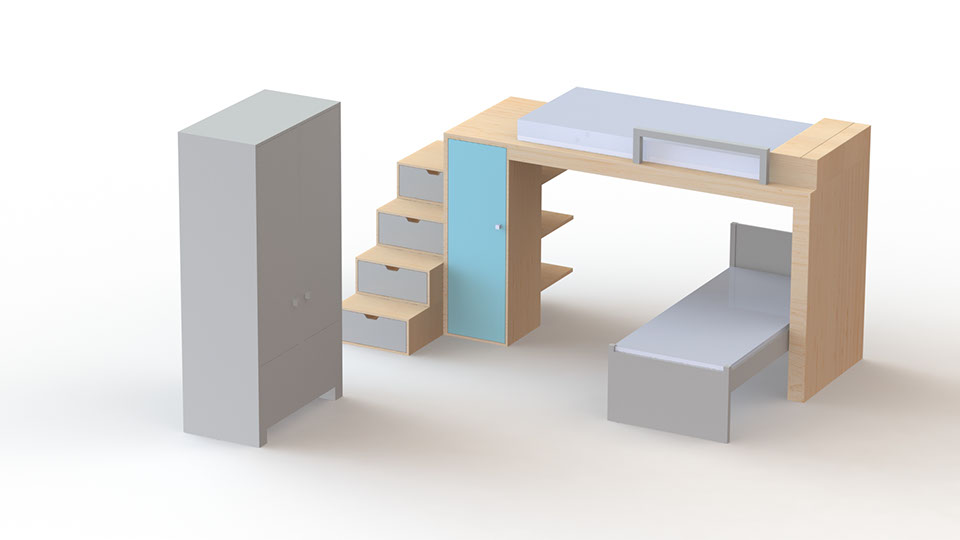 We were asked to plan a bed system for young teenagers, to replace existing cumbersome 2 bed layout. The room contained many pieces of furniture and items, together with a lack in storage space - which made life in the room uncomfortable, and devoid of personal space.