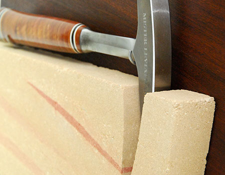 We designed an engraved hardwood panel on which a special 'rammed earth' block rested shaped to support the rock hammer. Rammed earth is an ancient building technology, whereby earth is rammed and compressed into molds to form walls and/or various building blocks. This totally 'green' technique uses quarry waste, combined with clay-rich soil put in layers in a mold so a staggering layer design is formed. With the help of friends from 'ADAMA NEGOHA' company from Beer Milka, Israel, we've harnessed this technique and managed to reach the desired form.