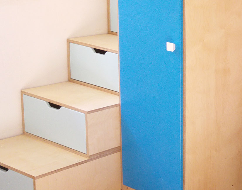 The solution was an elevated bed to divide the sleeping space. This height allowed for extra storage, both as a closet and more hidden shelves. The stairs were planned as deep drawers to provide more storage, and the top bed was fitted with a 'secret' box, for the occupant's personal items, and as a bedside table for books and light.