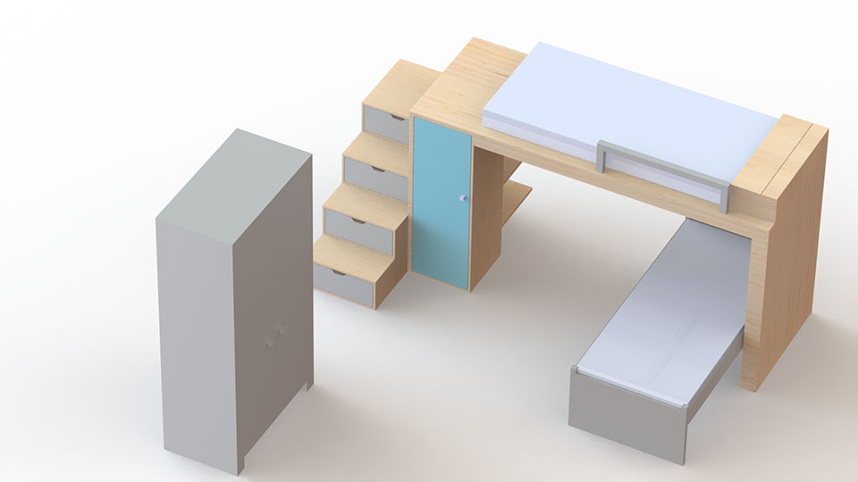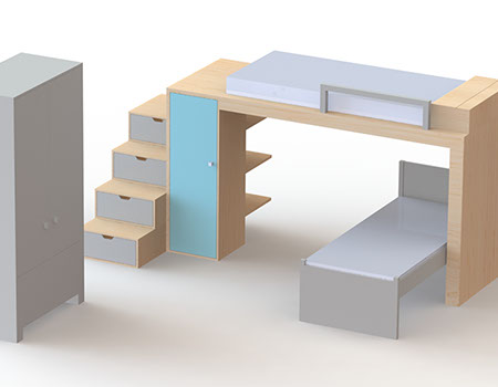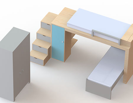 We were asked to plan a bed system for young teenagers, to replace existing cumbersome 2 bed layout. The room contained many pieces of furniture and items, together with a lack in storage space - which made life in the room uncomfortable, and devoid of personal space.